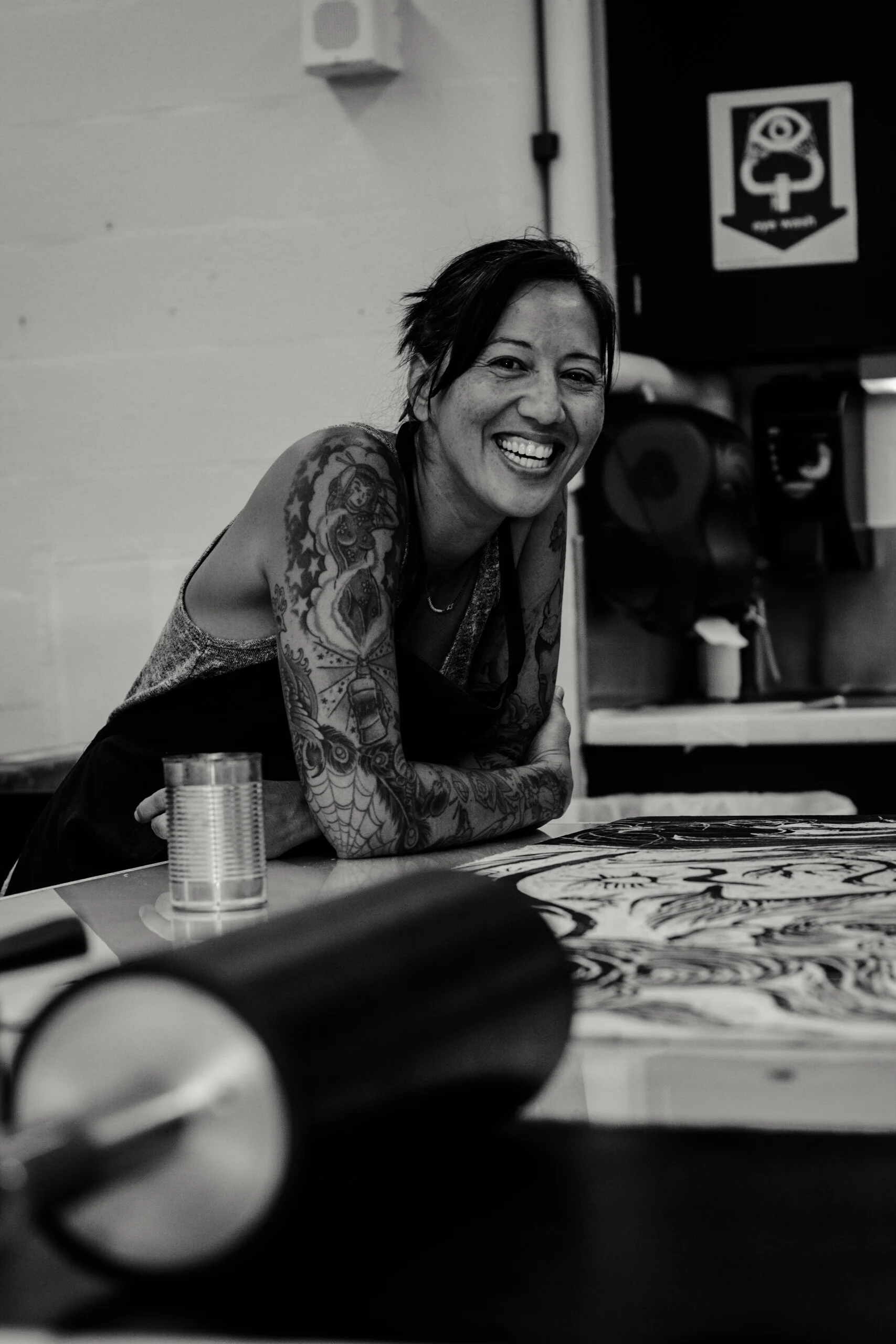 Kanani Miyamoto is a Japanese-American artist based in Portland. Her work draws inspiration from traditional Japanese styles of paper making, woodblock prints, and tattooing. Her imagery is at once classic and bizarre, featuring long, twisting tendrils of snakes scales alongside sweet, delicate peony petals.